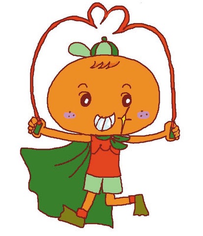 美浜町の特産である「みかん」をベースに、「ほうれん草」のマントをまとい、「エリンギ」のくつを履いたキャラクターです。健康促進のためにしている「なわとび」でやさしいハートを表しています。