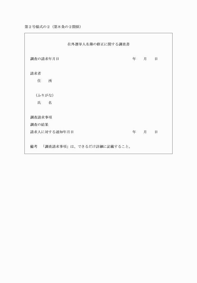 第8条の2 法第30条の13第2項において準用する法第29条第2項の規定により在外選挙人名簿の修正に関し、調査の請求があったときは、第2号様式の2の在外選挙人名簿の修正に関する調査書により整理しなければならない。