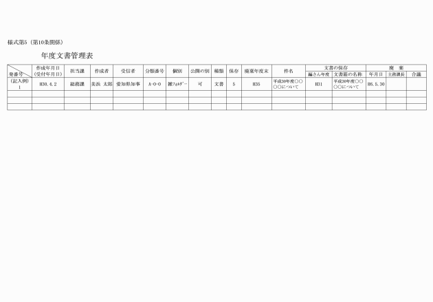 2 廃棄した文書に係る文書管理表は、文書を廃棄した日の属する年の翌年の初日から起算して3年間保存するものとする。